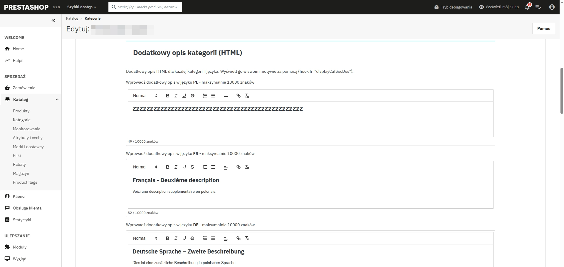 - W edycji kategorii pojawi się dodatkowa sekcja z polami dla opisów w poszczególnych językach.